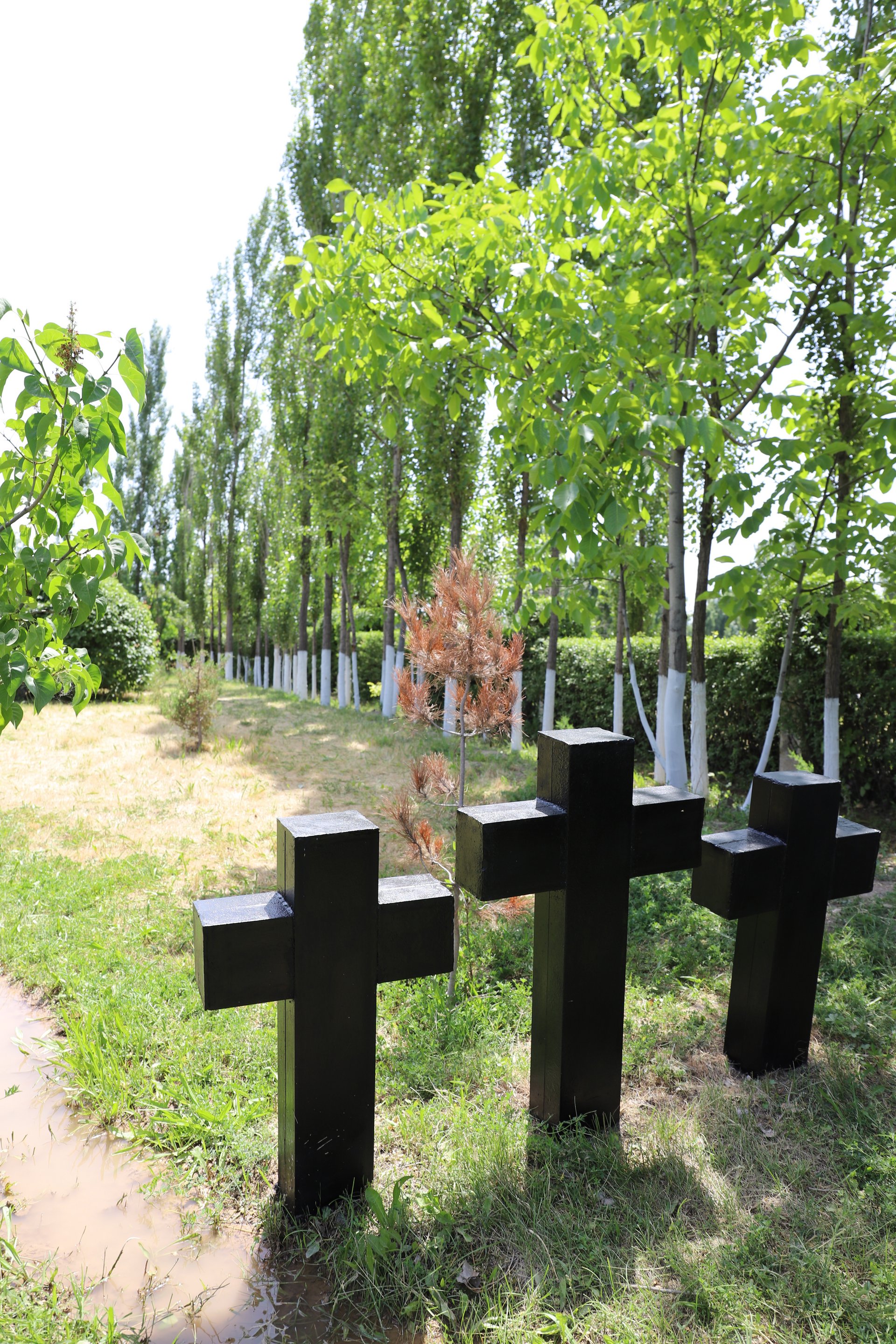 Die Gräber werden durch Symbolkreuzgruppen gekennzeichnet. Zentrales Mahnmal